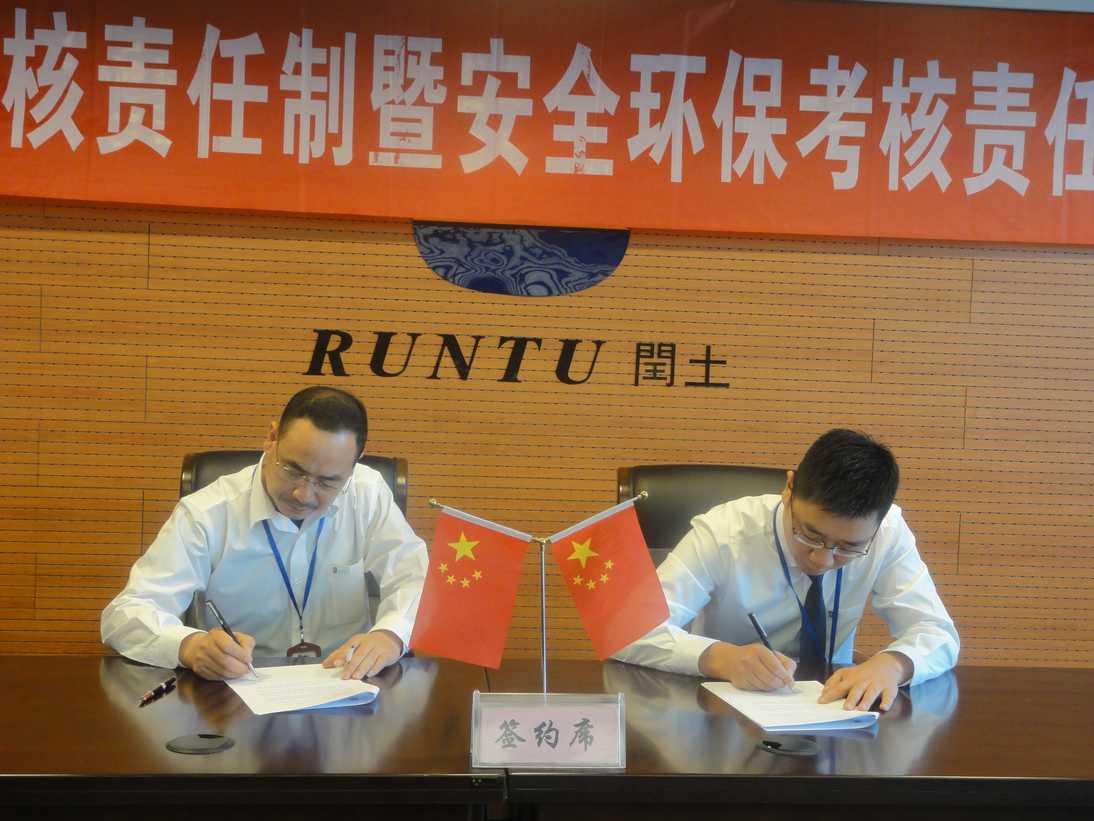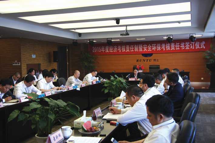5月5日上午,2015年度經濟考核責任制暨安全環??己素熑螘炗唭x式在閏土大廈舉行,會議由股份公司總經理徐萬福主持。董事長阮靜波、副董事長阮加春、副總經理阮光棟、各子公司董事長、總經理等出席簽訂儀式。