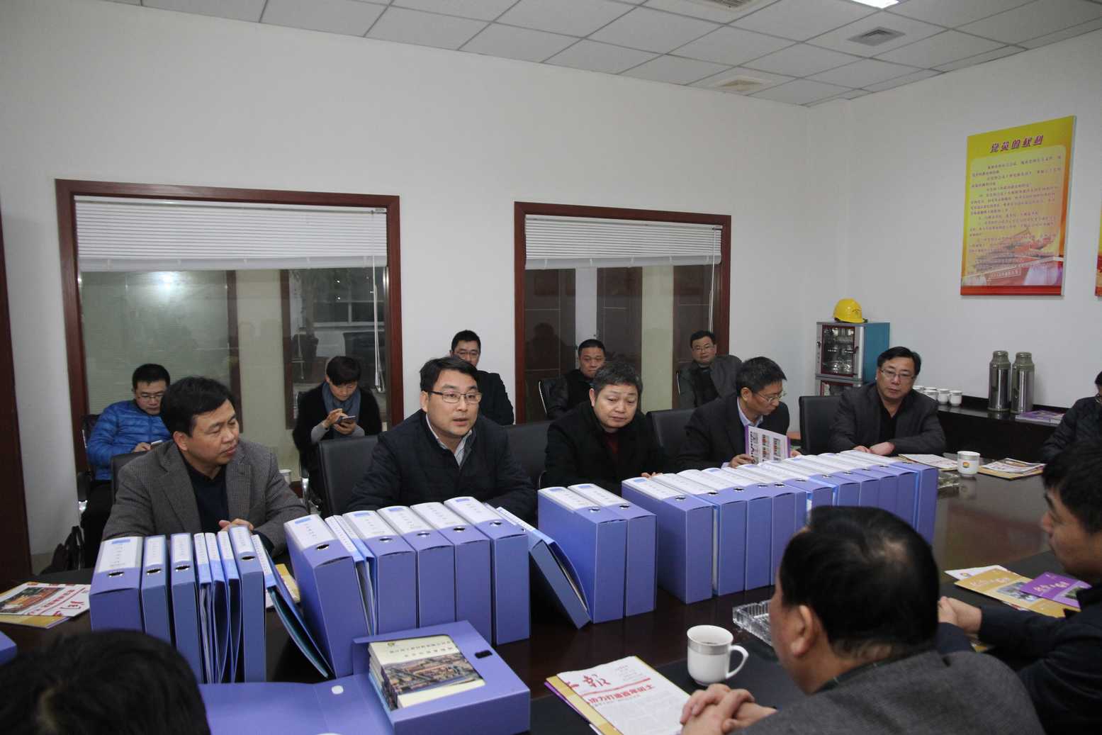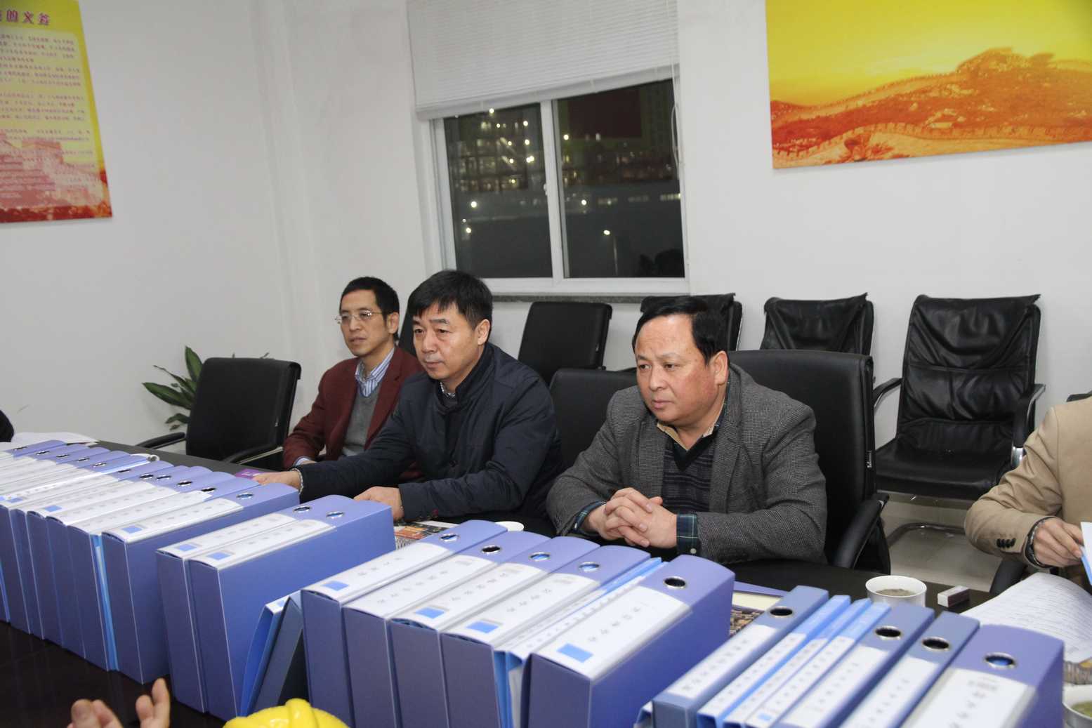檢查組領導在認真聽取企業關于安全生產工作的匯報。圖中,中間為國家安監總局職業健康司副司長王建冬、左一為省安監局總工程師李公杭、右一為紹興市政府副秘書長章國金。